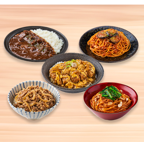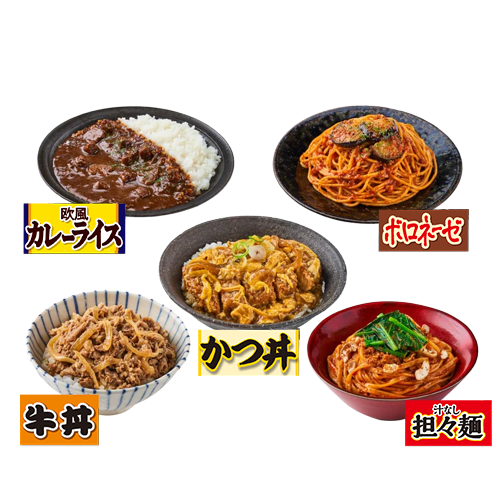 「かつ丼」「牛丼」「欧風カレーライス」「ボロネーゼ」「汁なし担々麺」の5種類のメニューを1食ずつ 計5食お届け!