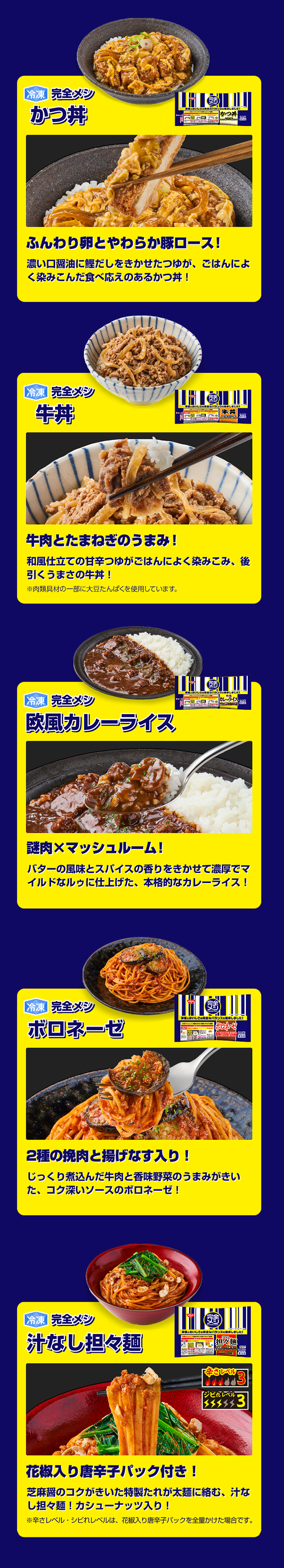 「かつ丼」や「牛丼」など一般的にカロリーや塩分などが高いといわれる”ガッツリ”メニューなのに、栄養とおいしさのバランス◎ 日清食品渾身のブランド「完全メシ」の冷凍シリーズです。