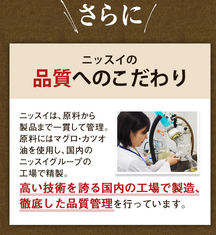 長年にわたり水産資源由来の機能性素材研究を手掛けてきたニッスイは、イワシなどの青魚に含まれるEPA(エイコサペンタエン酸)の持つ多様な作用に注目し、DHA・EPAの医薬品原料や機能性原料のNo.1サプライヤー(※1)として生産・供給するほか、自社でも特定保健用食品・機能性表示食品、サプリメントなどの健康食品に応用。独自の技術で、魚油独特の匂いを感じさせず、おいしく手軽に健康対策ができる商品づくりにこだわっています。