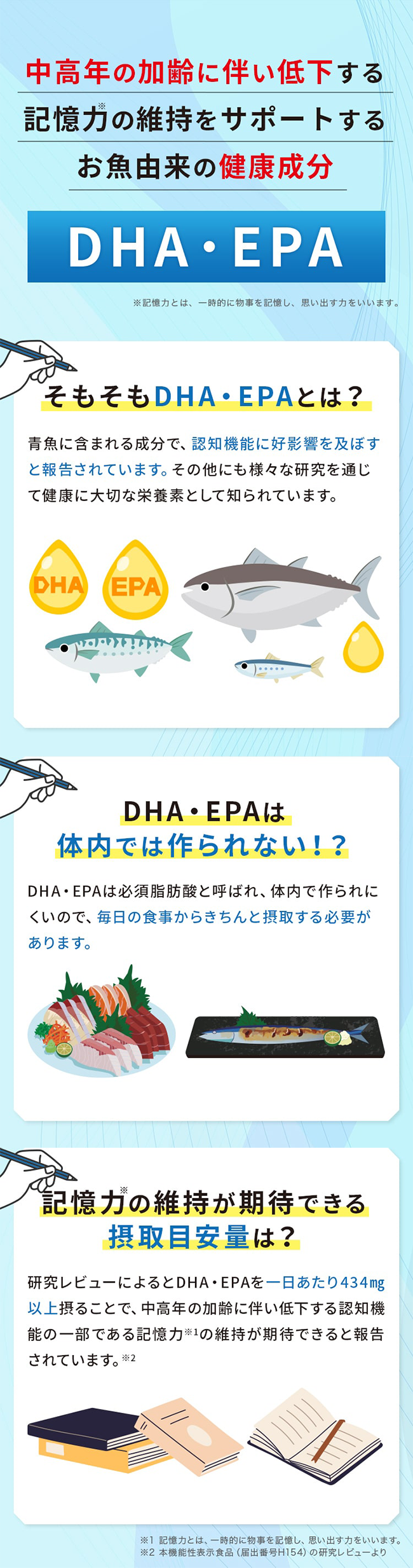中高年の方の加齢に伴い低下する認知機能の一部である記憶力※を維持することが報告されているDHA・EPAを1本に455mg配合。