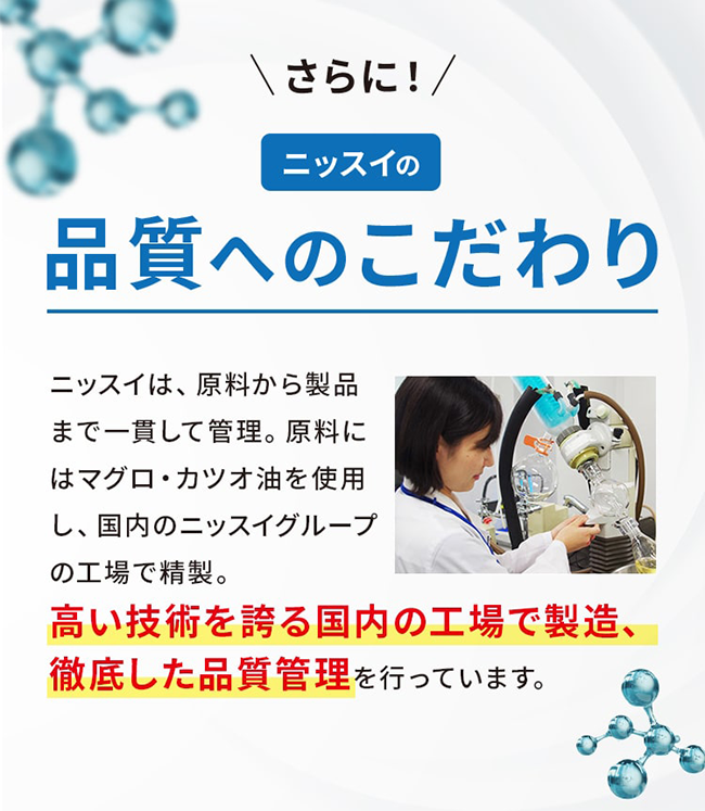 長年にわたり水産資源由来の機能性素材研究を手掛けてきたニッスイは、イワシなどの青魚に含まれるEPA(エイコサペンタエン酸)の持つ多様な作用に注目し、DHA・EPAの医薬品原料や機能性原料のNo.1サプライヤー(※1)として生産・供給するほか、自社でも特定保健用食品・機能性表示食品、サプリメントなどの健康食品に応用。独自の技術で、魚油独特の匂いを感じさせず、おいしく手軽に健康対策ができる商品づくりにこだわっています。