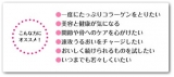 ●原材料名:コラーゲンペプチド(ゼラチン)、エリスリトール、還元パラチノース、クエン酸、サイクロデキストリン、香料、ビタミンC、カラメル色素、甘味料(アセスルファムK、スクラロース)、ビタミンB6、ビタミンB2