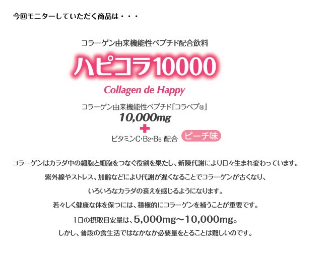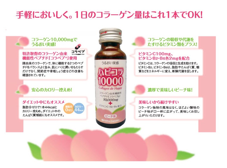 手軽に美味しく、1日のコラーゲン量はこれ1本で!ニッタバイオラボさまのハピコラ10000を飲ませて頂く機会を頂きました1箱10本入り2箱20本をお送り頂きました特許取得のコラーゲン由来機能性ペプチドコラペプを使用した手軽に飲むことができるコラーゲンドリンク♡♡年齢とともに減少していくコラーゲン… 2014/12/10
