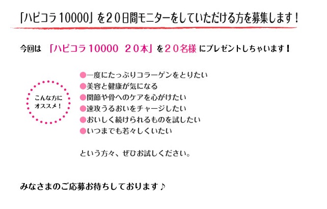 キレイになりたい人なら、まず知らない人はいない!というほどメジャーな美容成分といえば、”コラーゲン”!でも、コラーゲンならなんでもいいというわけではないのですやっぱり、必要な量をしっかり取り込みやすくなくっちゃね!ということで、飲んでみたのがこちらニッタバイオラボさんの『ハピコラ10000』!… 2014/12/15