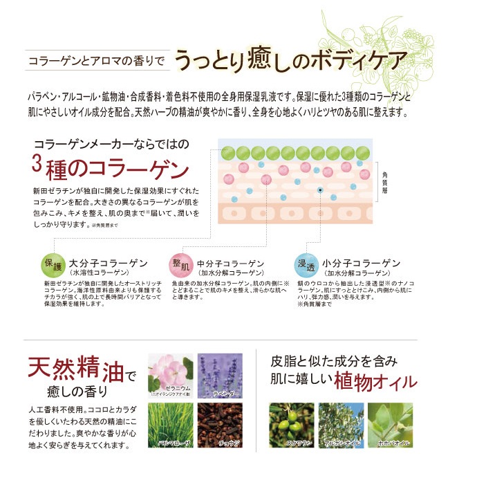 パラベン・アルコール・鉱物油・合成香料・着色料不使用の全身用保湿乳液。保湿に優れた3種類のコラーゲンと肌にやさしいオイル成分を配合。全身を心地よくハリとツヤのある肌に整えます。