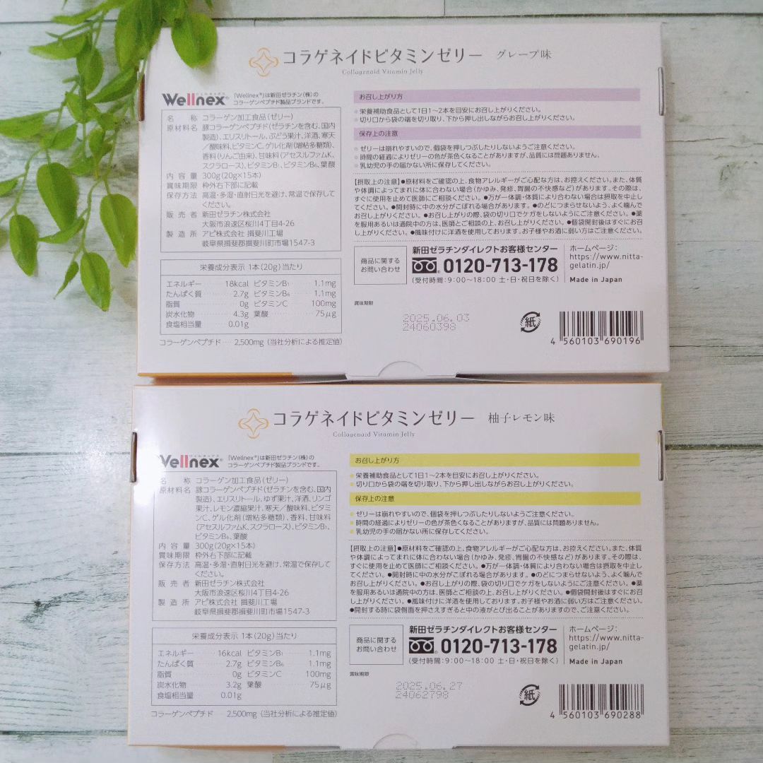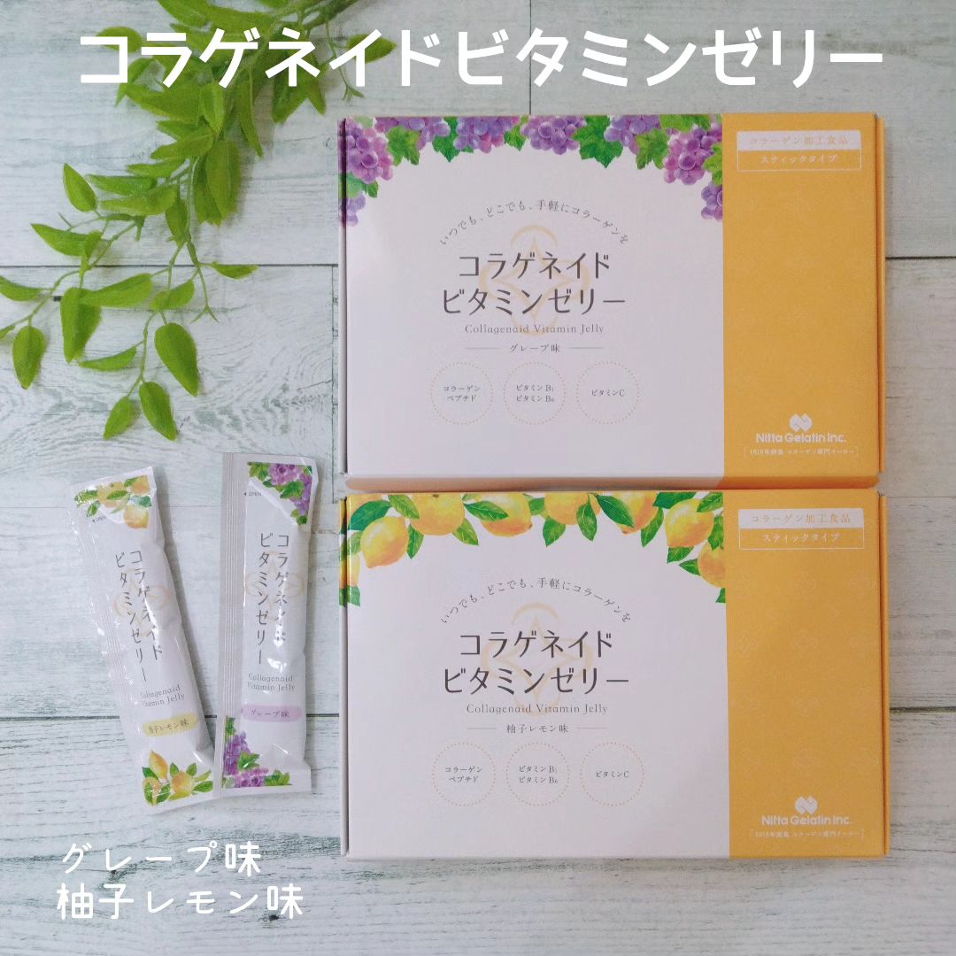 #PR #新田ゼラチン #コラゲネイドビタミンゼリー #おやつ代わりにコラーゲン補給 #monipla #nittagelatin_fan コラゲネイドビタミンゼリー〈グレープ味〉 1箱(20g×15本) コラゲネイドビタミンゼリー〈柚子レモン味〉1箱(20g×15本) おやつ代わりにコラーゲンが摂れる『コラゲネイドビタミンゼリー』です。 手軽においしくコラーゲンを摂ることができるぷるんと食感で、ゼリーにしては固めの食感です。 コラーゲンペプチドだけでなく、ビタミンB1、B6、ビタミンC、葉酸などの成分も一緒に摂ることができます。 スティックタイプのゼリーなので持ち運びもできて便利です。 私は冷蔵庫で冷やして食べています。 どちらもフルーティーでジューシー!とても美味しいです。 小腹が空いたときにもおすすめです。 いろいろな形でコラーゲンを摂取したいので、こちらはデザート感覚で摂取できるので気に入っています。