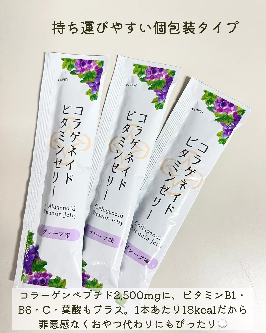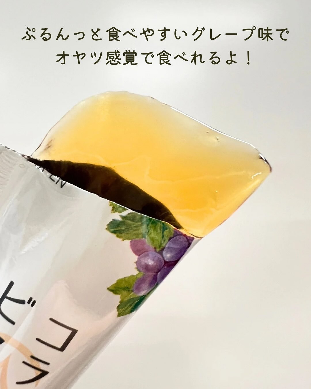 \おやつ感覚でコラーゲン補給💜/ 🏷️コラゲネイドビタミンゼリー〈グレープ味〉(1箱20g×15本) ぷるんっと食べやすいグレープ味のスティックゼリー✨ コラーゲンペプチド2,500mgに、ビタミンB1・B6・C・葉酸もプラス。 1本あたり18kcalだから、罪悪感なくおやつ代わりにもぴったり💭 忙しい日でも、手軽においしく美容ケア💜 デザート感覚でコラーゲンをチャージできるよ🍇 今2箱目食べてるけど、乾燥しにくくなったような✨おいしいから毎日続いてるよ〜😋 #PR #新田ゼラチン #コラゲネイドビタミンゼリー #おやつ代わりにコラーゲン補給 #monipla #nittagelatin_fan