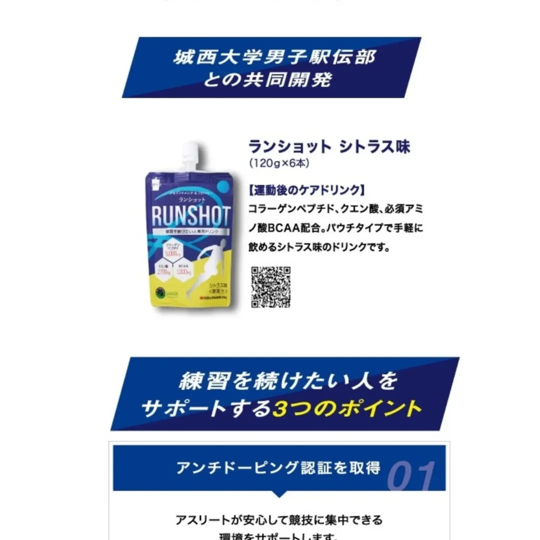 運動後による疲れやダメージを明日に残さないための3つのケア成分を配合。1本にコラーゲンペプチド5,000mg(ジョイントメンテ)、クエン酸2,700mg、BCAA1,000mg。