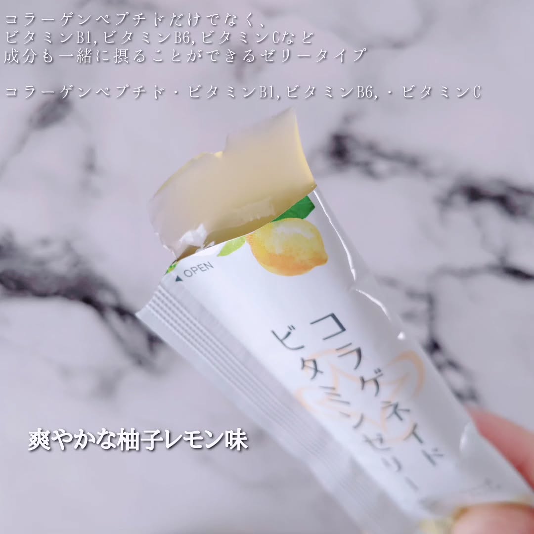 1本でコラーゲンペプチド2,500mgが摂れる美味しく、食感にこだわったコラーゲンゼリーです。 コラーゲンペプチドだけでなく、ビタミンB1、B6、Cなどの成分も一緒に摂れる柚子レモン味のスティックタイプのゼリー。 手軽においしく、おやつ代わりにコラーゲン補給したい方におすすめです。