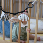 ボーダーやストライプ模様で赤ちゃんの視覚を楽しませてくれるソフトトイ。ロープでベッドやベビーカーに取り付けることができるので、ねんね期の赤ちゃんの遊びや、おむつ替え時、ベビーカーでのお散歩や車でのお出かけ時など、さまざまなシチュエーションで吊るしたり