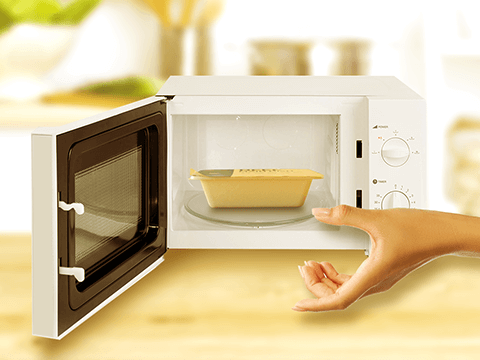 お弁当の蓋の左下を少し開けて、レンジで指定の時間温めるだけで、