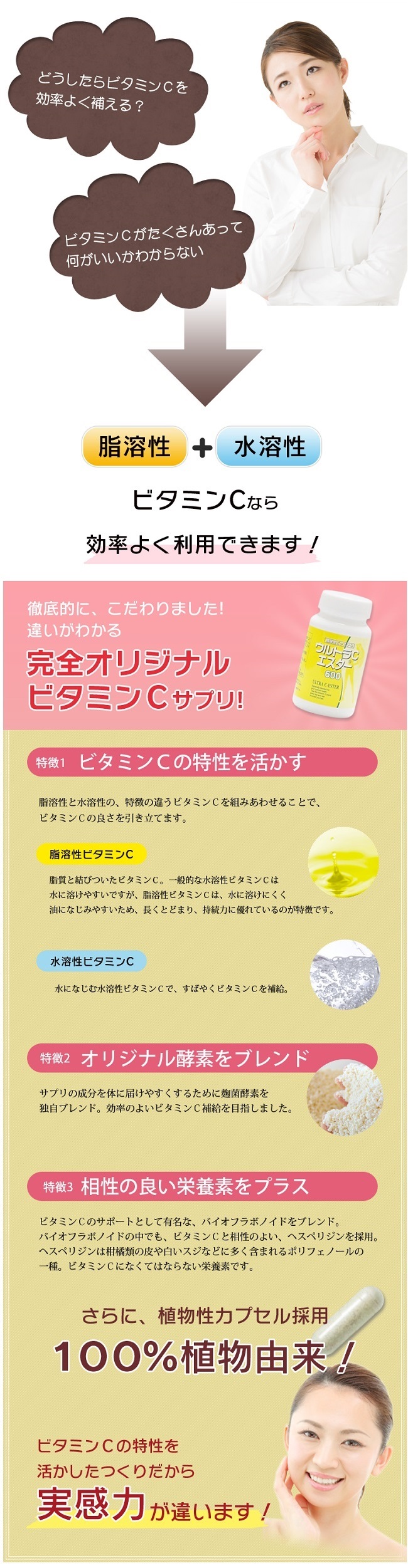 すばやく届いて長くとどまる、体がよろこぶビタミンCサプリ!ウルトラCエスターは、脂溶性のビタミンCを主原料に、水溶性のビタミンCと、酵素をブレンドした、N・S・S独自のビタミンCサプリ。特徴の違う2種類のビタミンCと酵素をブレンドすることで、多方面からアプローチでき、素早く届いて長くとどまる、ビタミンCサプリをめざしました。脂溶性ビタミンCは、脂質が結びついたビタミンCです。一般的な水溶性ビタミンCは水に溶けやすいのに比べ、脂溶性ビタミンCは、水に溶けにくく脂に溶けやすい性質を持ち、長くとどまりやすいといわれますビタミンCと相性のよいヘスペリジンをブレンド。さらに、植物性カプセルを採用した、100%植物由来のサプリメントです。ビタミンCの特性を徹底的に考えてつくりあげた、どこにもないこだわりのビタミンCサプリ! ご自身、そしてご家族の美と健康のために是非お役立て下さい。