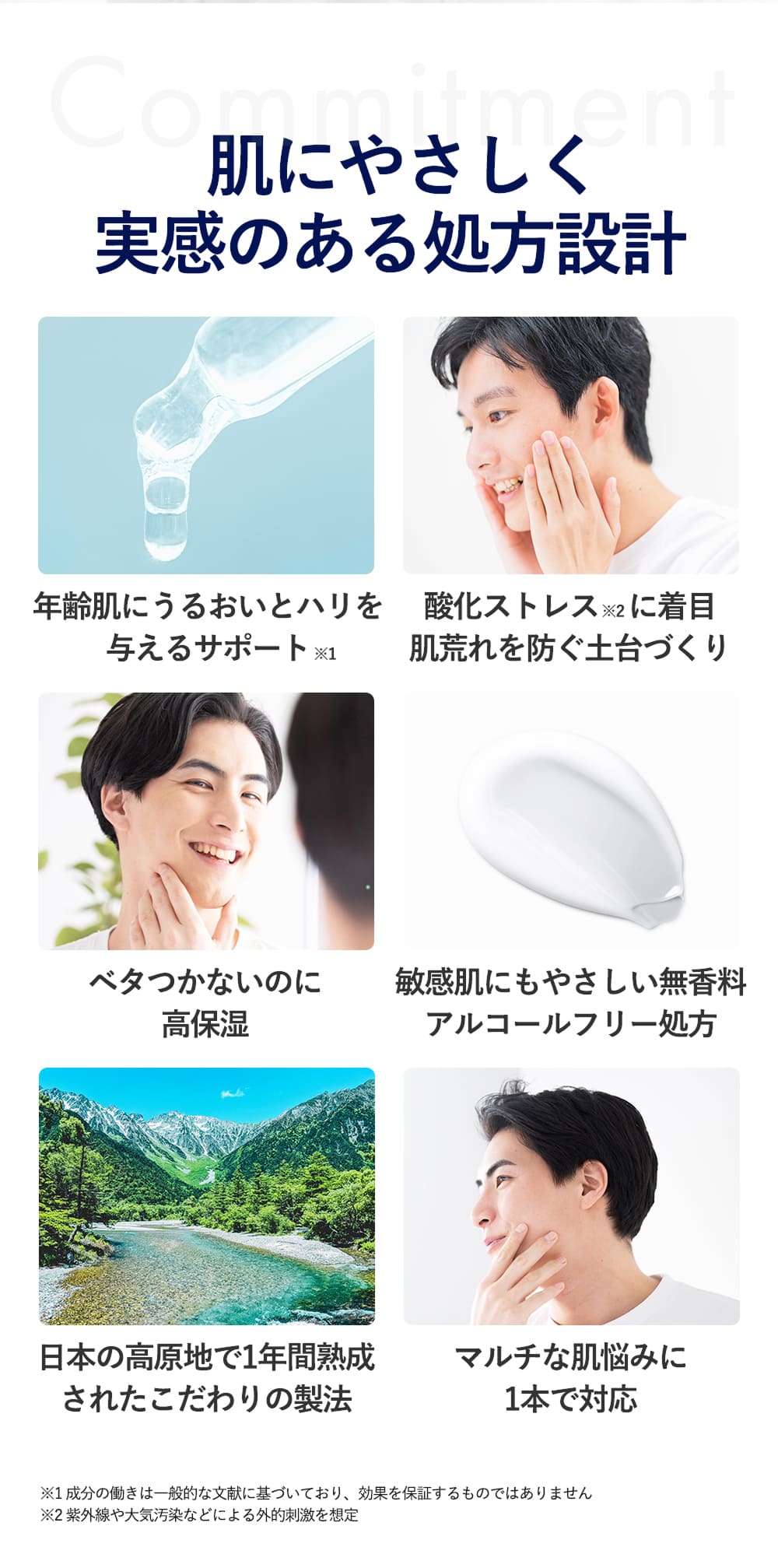 プロフェッショナルな品質をシンプルで使いやすいアイテムに落とし込み、忙しい男性でも自然に取り入れられるスキンケアを提供します。肌のケアを「自信を磨くための投資」として捉え、美容のプロが認めた処方設計で開発。肌への投資が未来の印象と自信につながる価値観を大切にし、すべての男性に自信を持って届けます。