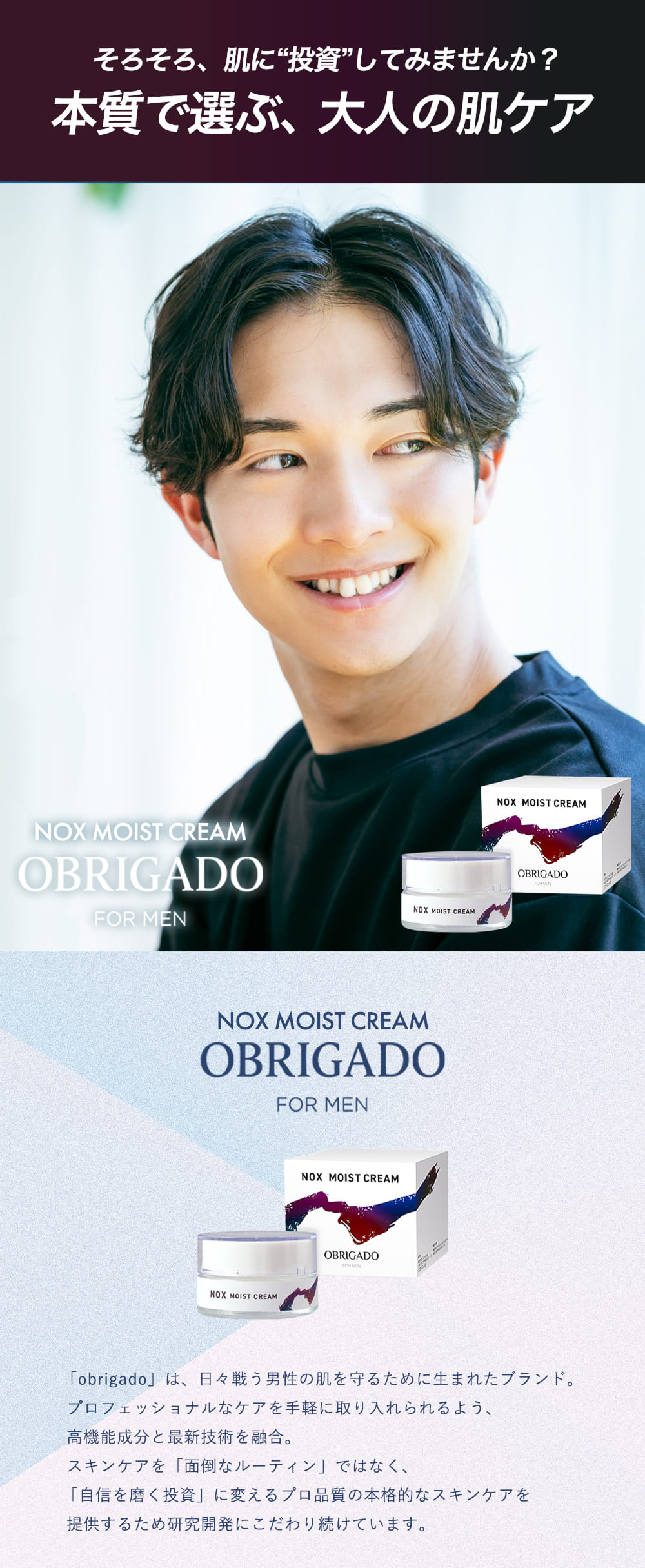 OBRIGADO(オブリガード)は、プロフェッショナルな品質をシンプルで使いやすいアイテムに落とし込み、忙しい男性でも自然に取り入れられるスキンケアを提供します。肌のケアを「自信を磨くための投資」として捉え、美容のプロが認めた処方設計で開発。肌への投資が未来の印象と自信につながる価値観を大切にし、すべての男性に自信を持って届けます。