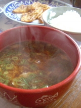 先日書いた、オーガランドさんのごぼう茶 お茶がらは食べられるって書いてあったので 豚汁の中に潜ませてみました 黒っぽい小さいのがごぼう茶のお茶がらです ちなみにこの日の夕食は豆腐のこってりステーキとれんこんとごぼうとニンジンのキンピラ、豚汁と納豆です ランチョンマットがちょっと… 2013/04/23