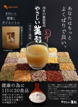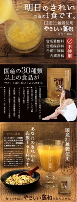 国産雑穀21種類をそのままパウダー状まで粉砕し、「合成着色料」「合成保存料」「合成甘味料」「合成香料」不使用にこだわり、国産黒大豆から作ったきなこで口あたりの良いやさしい甘みに仕上げました。