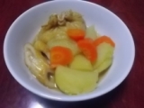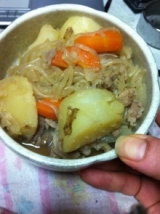 肉じゃがを作りました材料は、人参1本、玉葱1個、ジャガイモ3個、白滝1袋、豚肉100gです調味料は酒大さじ2 しょうゆ大さじ2 砂糖大さじ2 みりん大さじ2ですまず豚肉100グラムを大さじ1のサラダ油で炒めて白滝、人参、ジャガイモ、玉葱を入れて炒めてから水300グラムを入れますそして鰹あごだ… 2013/02/02