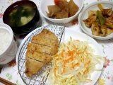 昨日の夕食です とんかつ 千切り野菜 ネギとちくわの豆板醤炒め 大根と豚肉の煮物 わかめと卵の中華スープ ごはん牛乳フルーツジュース とんかつは100g69円の豚ロース肉を使用していますo(^^)o 1人分の材料費は200円くらいかな かつを揚げる時はまとめて揚げておいて、翌… 2011/01/31