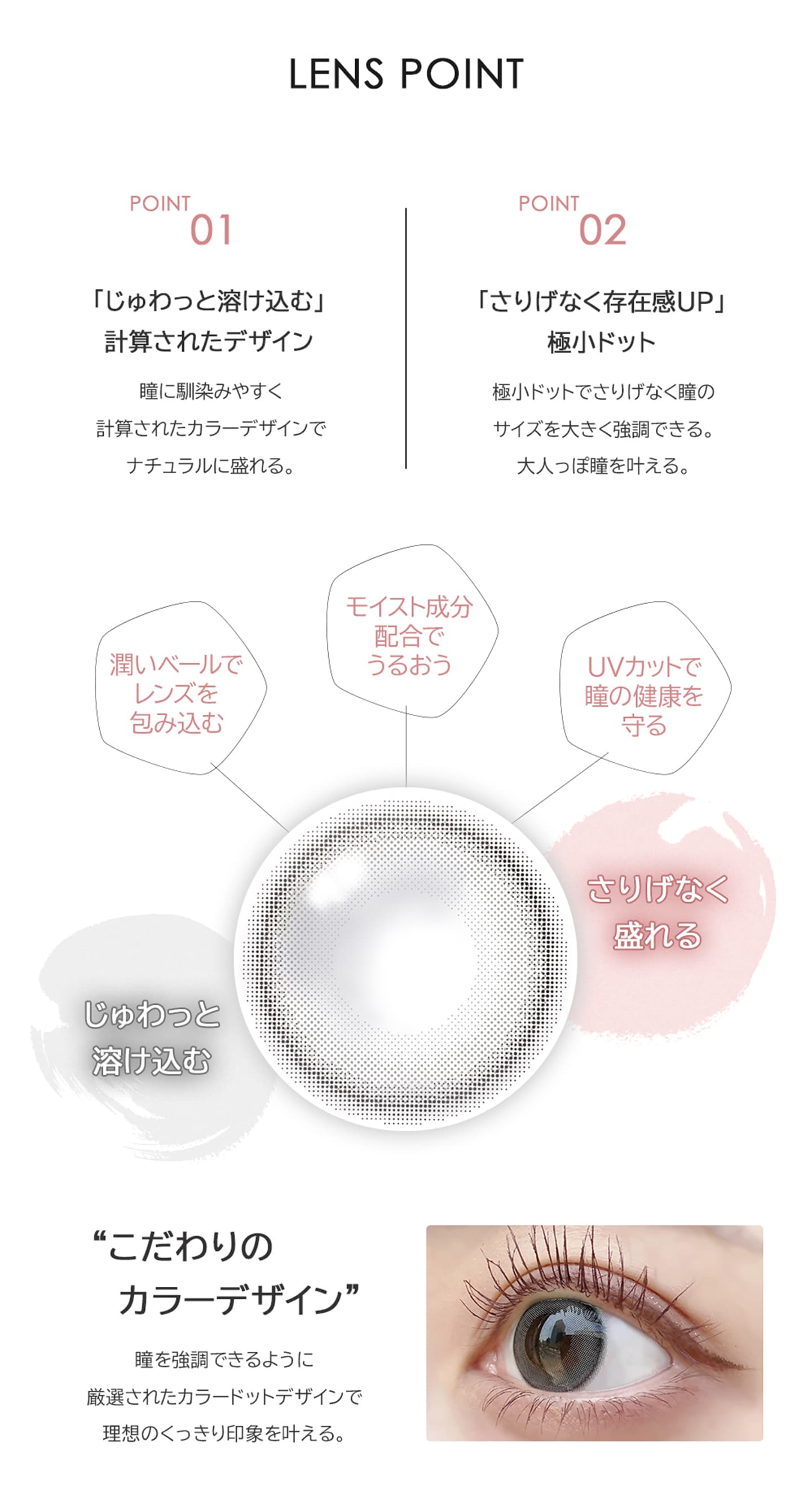 ナチュラルに瞳に馴染みやすく、ちゅるんと盛れる透明感レンズが特徴♪