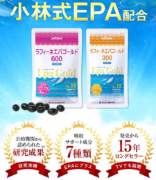 ★ラフィーネエパゴールド600(120粒入り)は、山口大学大学院医学部の小林誠教授との共同開発によって誕生した、特許成分「小林式EPA」を配合。さらにウコンやタウリンなど7つの天然由来成分を配合し、吸収にもこだわりました。