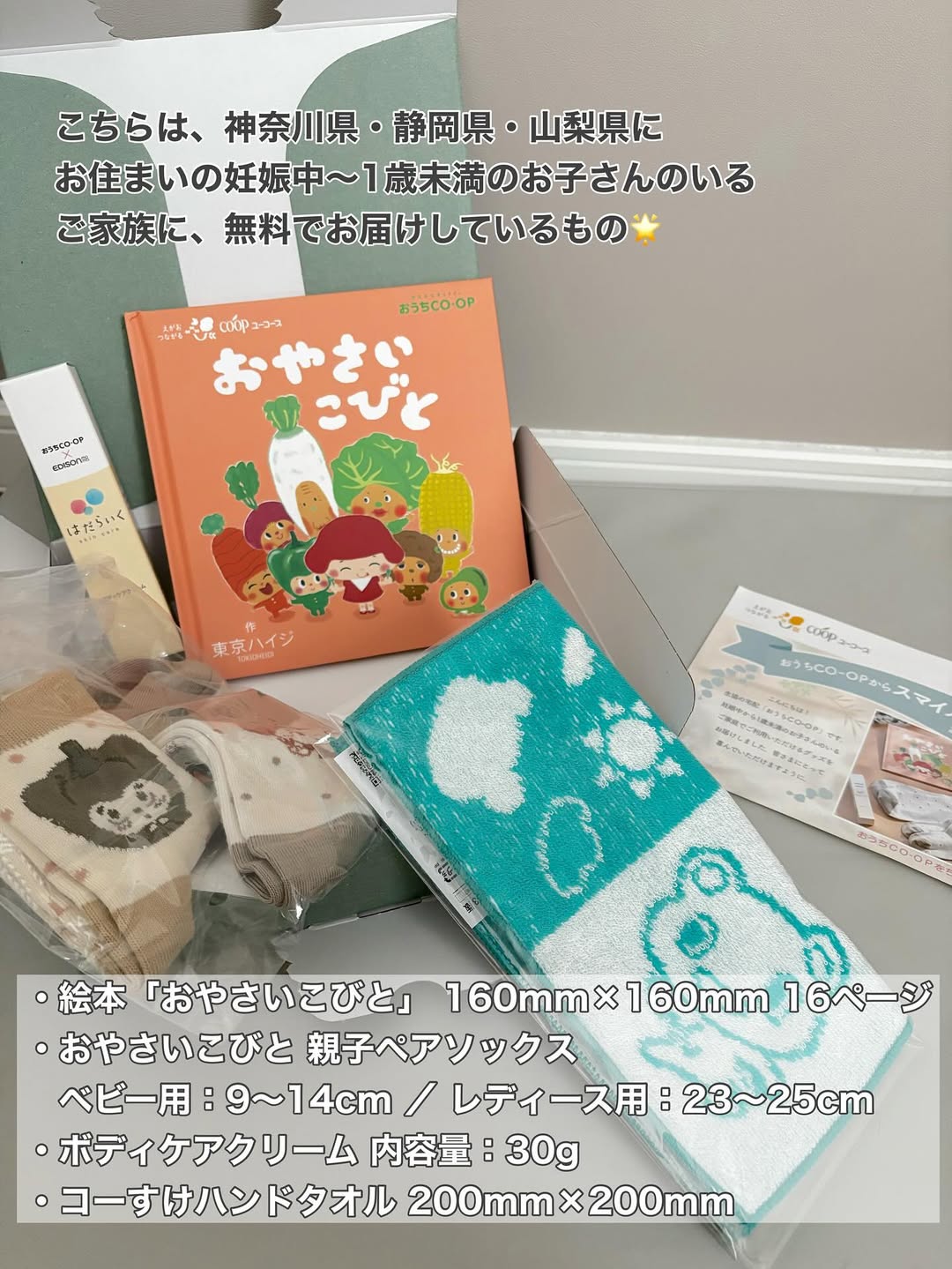 ▷おうちコープ スマイルボックス 出産お祝い『スマイルボックス』のご紹介です🤍 こちらは、神奈川県・静岡県・山梨県にお住まいの妊娠中~1歳未満のお子さんのいるご家族に、無料でお届けしているもの🌟 中身は、、、 ・絵本「おやさいこびと」 160mm×160mm 16ページ ・おやさいこびと 親子ペアソックス ベビー用:9~14cm / レディース用:23~25cm ・ボディケアクリーム 内容量:30g ・コーすけハンドタオル 200mm×200mm 絵本はカラフルでこどもの目を引く感じでかわいいと思いました♡野菜をモチーフにしたキャラクターたちがでてくるので食育にも繋がりそう👏🏻 靴下は、オーガニックコットンで履き心地が気持ちいいと思いました🧦こどもとの初めてのおそろいがうれしい🥰もう少し大きくなって寒くなってきたら履いてもらおう〜! ボディークリームは妊娠線ケア向けのようです! ハンドタオルは汗拭いたり、ミルクの吐き戻しを拭いたり、、、といつまでも使えそうです✨ #PR #ユーコープ #おうちコープ #おうちCOOP #monipla #ouchicoop_fan