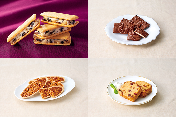ラムレーズンとクリームをサブレ生地で挟んだレーズンサンドです。