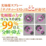 光触媒は太陽や蛍光灯などの光が当たると、その表面で強力な酸化力が生まれ、接触してくる「細菌・雑菌・カビ菌・ウイルス・シックハウスの原因となる化学物質・悪臭・ヤニ汚れ・・・」などの有害物質を除去することができる環境浄化材料です。光触媒パルクコートは人畜無害で安全で、環境への問題もありません。