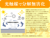 光触媒は太陽や蛍光灯などの光が当たると、その表面で強力な酸化力が生まれ、接触してくる「細菌・雑菌・カビ菌・ウイルス・シックハウスの原因となる化学物質・悪臭・ヤニ汚れ・・・」などの有害物質を除去することができる環境浄化材料です。光触媒パルクコートは人畜無害で安全で、環境への問題もありません。