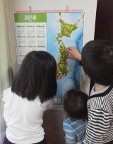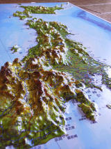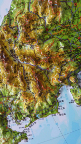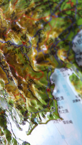 日本とその周辺の地図が、凹凸のついた立体で表現してあります。新幹線の路線や原子力発電所の場所、日本の山脈がどのように隆起しているかを3Dで確認することができます。
