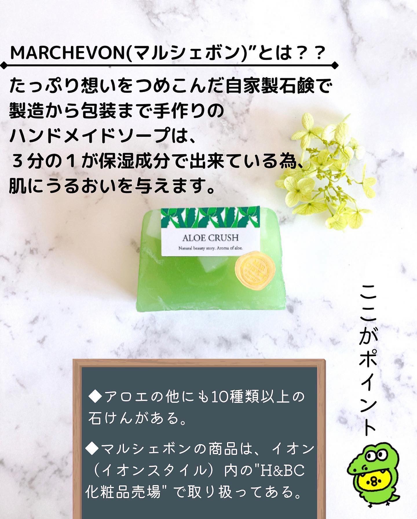 ペリカン石鹸さまの 【MARCHEVONマルシェボン】 🧼アロエクラッシュ🧼 お試しさせて頂きました その❷ ここでおさらい⏬ 製造から包装まで 手間暇かけて作られた自家製石けん。 石けんの3分の1が潤い成分で 洗い上がりもしっとり✨ とにかく❣️良い香りと 美味しそうな果肉の形で 思わず食べたくなるような ジューシーな色で楽しませて もらってます💓 洗った後はすごく滑らかな肌に なるんですよー 美味しい匂いがめっちゃ気に入った。 泡立ちも良い💮 【泡立ち動画見てね】 10種類以上のMARCHEVONマルシェボン (HP見てみて下さい) みんな大好きイオンの化粧品売り場で もう見に行ってくれました? @emiriiiiiiiiy65←他の美容レビューも 見て頂けたら嬉しいです☺️💓 #MARCHEVON #マルシェボン #アロエクラッシュ #アロエベラ #石鹸マニア #イオン #ペリカン石鹸 #monipla #pelicansoap_fan#石けん#つるつる肌#すべすべ肌#ボディケア#スキンケア#フォローバックします#美容好きな人と繋がりたい
