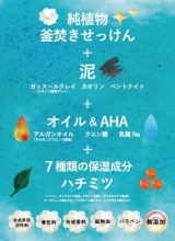 全成分/石ケン素地、水、グリセリン、ジグリセリン、モロッコ溶岩クレイ、ベントナイト、カオリン、アルガニアスピノサ核油(アルガンオイル)、乳酸Na、クエン酸、パパイン、ダマスクバラ花水、アロエベラ液汁、グリチルリチン酸2K(甘草由来)、アーチチョーク葉エキス、ヘラオオバコ葉エキス、ヒイラギメギ根エキス、ハチミツ、オレンジ油、チョウジ油、パチョリ油、ビターオレンジ葉/枝油、ブルネシアサルミエントイ木油、サリチル酸Na、BG、デキストリン、変性アルコール