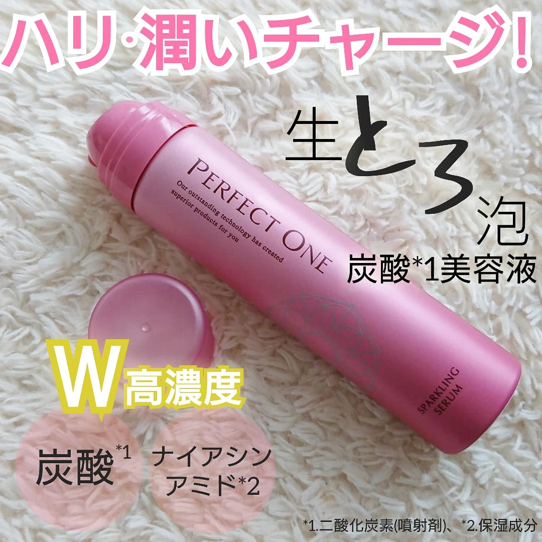 年齢とともにスキンケア効果を感じにくくなってきてるような..... “うるおい”だけでなく“お肌のハリ”も欲しい! そんな大人の肌悩みにアプローチしてくれる パーフェクトワンさんから4/15より新発売された 『✨スパークリングセラム✨』を一週間前から使い始めてます☆ 毛穴より小さい生とろ泡炭酸※1美容液で、 W高濃度の炭酸(※1)8,000ppm × ナイアシンアミド(※2)10%配合により うるおいのあるハリ肌へと導いてくれるそうです◎ トロッとした濃密炭酸※1泡でパチパチすることなく ジュワっと素早く溶ろけ密着するように馴染む塗り心地♥️ しっとりするような使い心地で ベタつきもなく軽やかめなのもお気に入り♥️ お肌にのせて伸ばすときに 「ジュワ」とする感じがたまらなく心地いい😉 朝晩使ってると、 肌が柔らかくなってきてるような感じもするし 化粧のりもいいな~と感じてます!! 1品7役※3と高機能なオールインワン炭酸※1セラム、是非チェックして試してみて下さい♪ ※1、二酸化炭素(噴射剤) ※2、保湿成分 ※3、化粧水、乳液、美容液、クリーム、パック、化粧下地、ネッククリーム #PR #新日本製薬株式会社 #スパークリングセラム #高濃度炭酸泡美容液 #炭酸コスメ #炭酸スキンケア #ナイアシンアミド #美容液 #パーフェクトワン #monipla #perfectone_fan
