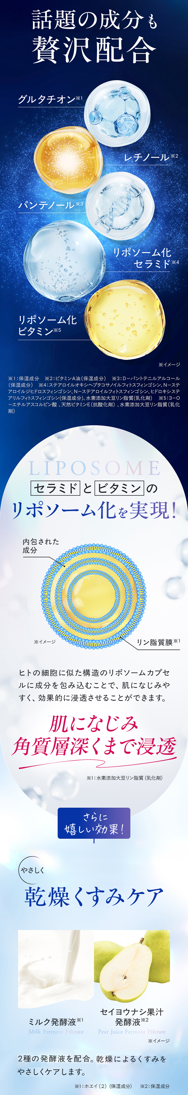 さらにAHAを含む2種のエキスを配合※2。肌のキメを整え、リポソーム化ビタミン※3、リポソーム化セラミド※4が角質層深くまでじわじわと浸透。これ一つで美白※5・うるおい・ハリ をまるっと対策。艶肌へ導きます。