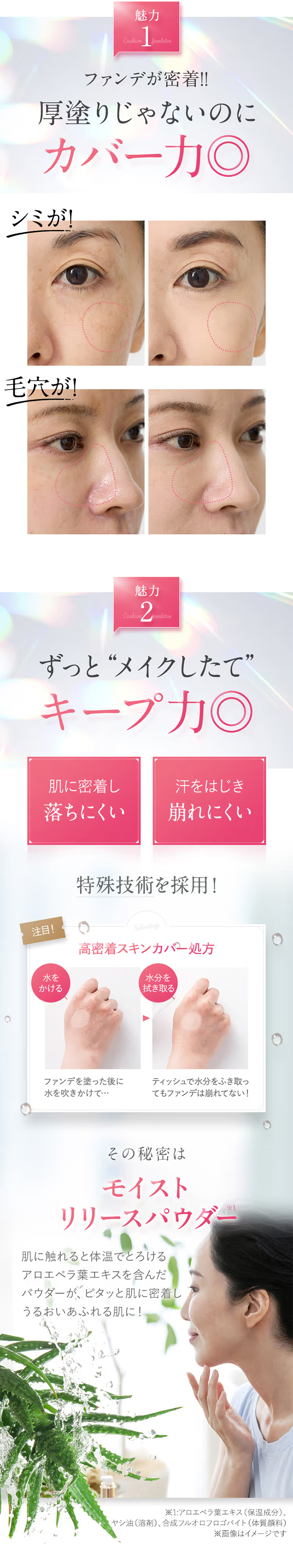 肌に密着しカバーしながら潤いを与え、仕上がりもキープする「高密着スキンカバー処方」採用。