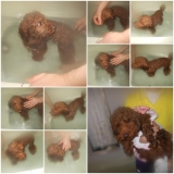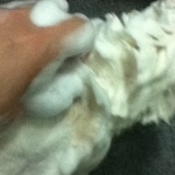 シャンプー前によくブラッシングし、お湯で被毛を十分に濡らします。
