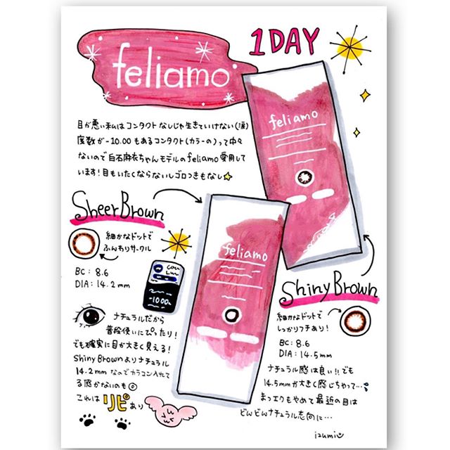 #feliamo ⚠️☠️2枚目、目写真注意☠️⚠️ * 最近の普段使いカラコンは#フェリアモ 👁 前まではフランミー使ってたんだけど最近 ゴロゴロするようになってフェリアモに! 今のところトラブルなしで使えてます🙌 フェリアモの良いところは度数-10.00まであるの❣️ 私乱視が強すぎてソフトレンズじゃもう矯正できなくて カラコンでも乱視用あるけどそんなんじゃ足りないので 使いたいなら度数上げるしかないね〜と言われて マックスの-10.00使ってます😭が、クリアには見えない😭 * マツエクもやめて目がナチュラル志向になってるので シアーブラウンの14.2mmが自分的に使いやすかった✨ ナチュラルで普段使いにぴったりです♩ けど夏だし遊びカラコンも欲しいな〜〜😂 ナチュラル志向になるとまた遊びたくなる矛盾😂 * #カラコン#カラーコンタクト#白石麻衣#ワンデー #monipla#pia_fan#シャイニーブラウン #シアーブラウン#ナチュラルカラコン#メイク #絵日記#イラストエッセイ#手書きツイート #いずみコスメレポ