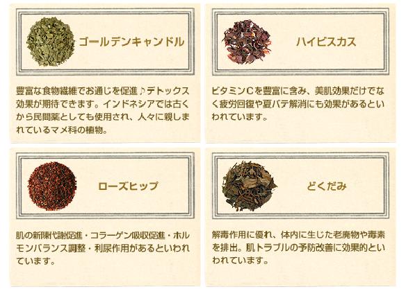 食物繊維が豊富なインドネシアの野草「ゴールデンキャンドル」を中心に、クコやローズヒップなど18種類の美肌茶葉を独自にブレンド。