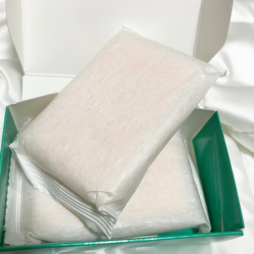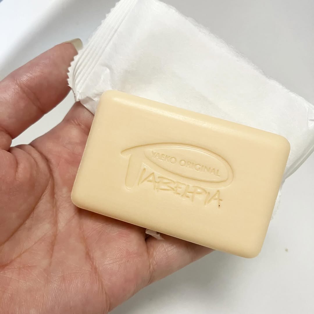 パッケージはレトロ感あるデザインです。箱を開けてみると個包装になった石鹸が二つ入っています。自分は大きいものより小さい方が好みで、大きいものは切って分割して使っているので今回サイズ感ちょうど良かったです◎