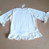 袖と裾に施したフリルがフェミニンな印象を与えながらも、裾フリルで気になる腰周りの体型カバーも叶う優れもの!