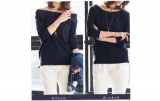 ボートネックで着用すると7分袖くらいになり、季節感のある風合いに。