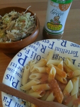 買い物かご下げて 人差し指で頬をつつきながら ↑サザエさん どうしましょ というのも お野菜、お高いからねー ペンネ 海老クリームソース 買ってきた キャベツの千切りには いつもの大好きピエトロどばどばってかけた 普通の新鮮なお野菜の千切り これが一番のごちそうだわ♪ それに… 2014/01/05