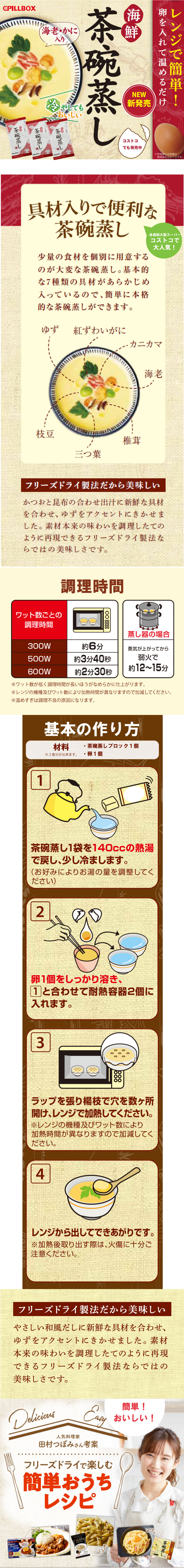 会員制大型スーパー コストコで大ヒット!累計500万食を突破した大人気商品『茶碗蒸し』の最新作「海鮮茶碗蒸し」の3包(6食分)セットです。たまごを入れてレンジで温めるだけの簡単調理はそのままに、海鮮の味わい深い旨味と香りが広がる、本格的な茶碗蒸しが出来上がります。