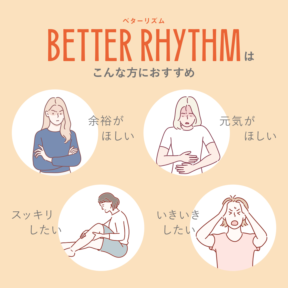 「BETTER RHYTHM ベターリズム」は、余裕がほしい、元気がほしい、スッキリしたい、いきいきしたい、そんな方におすすめのサプリメントです。