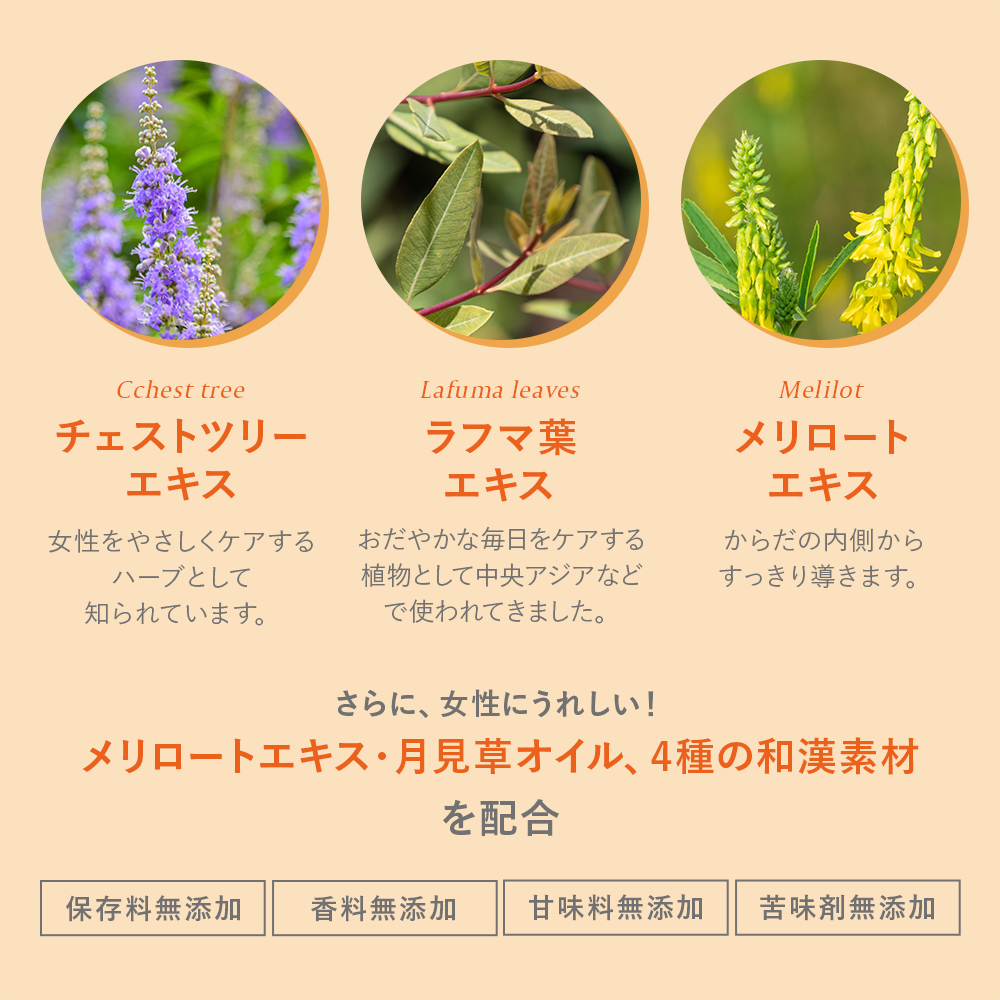 「チェストツリー」「ラフマ葉エキス」「メリロートエキス」や、「大豆イソフラボン」「月見オイル」「4種の和漢素材」がやさしく整えます。