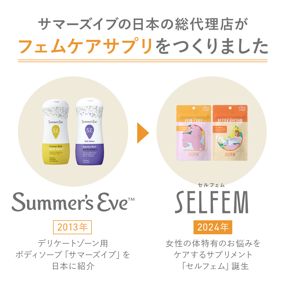 "SELFEM セルフェム"は、デリケートゾーンケアブランド”サマーズイブ”の総代理店が本気で考えた、内側からのフェムケアに特化したサプリメントブランドです。