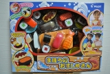 セット内容:鉄火巻き、かっぱ巻き、トロ(マグロ)、イカ(イカバジルソース)、たまご(サーモン)、銀の魚(金のさかな)、たまご太巻き(花太巻き)、納豆軍艦(イクラ軍艦)、穴子(タレ付き穴子)、エビ(車エビ)、皿6枚、はけ、まほうの壺、げた、包丁、収納袋、プレイシート