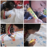 トミカに続いておえかき大好きな来輝 でもクレヨン渡して放置するのは怖くてなかなか渡せず… でもこの『スイスイおえかき』ならその心配なし 水で書くからどこも汚すことないし こんな感じで大きなシートとペンが入ってます ペンにもちょっとした工夫がしてあって… 子供が簡単にペン先… 2014/01/05
