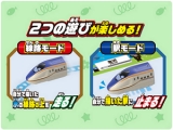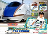 2014年にデビューしたE7系新幹線がスイスイおえかきで新登場。発射ベルや走行音、アナウンス等いろいろなサウンドがたのしめます!自分で描いた線路の上を音声を流しながら新幹線が走る!