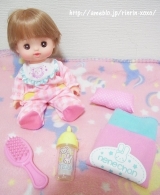 セット内容:ネネちゃん本体(おむつ付き)、ベビーオール、おふとん、まくら、ブラシ、ミルクびん、ミニガイド
