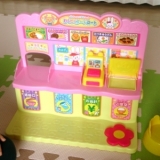 色々な食べ物、テーブルといすが付いたフードコートのセットです。受け取りに立つと食べ物が出てきたり、レジボタンを押すと引き出しが開いたりします。食べ物はまるで食べたように見える仕掛けもあります。